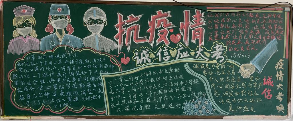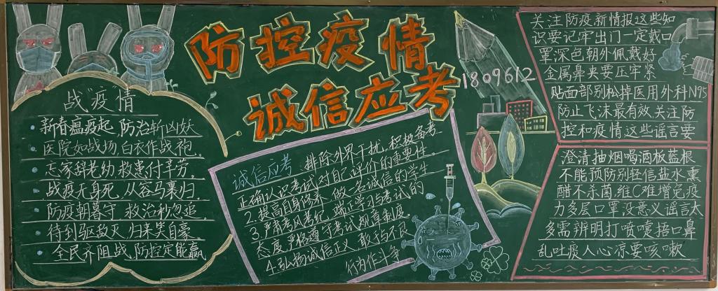 本次黑板报评比的主题为 “疫情防控不放松, 备战高考不停步”,各班由本班班主任指导,员工自主完成。黑板报内容新颖丰富,宣传了预防疫情知识和注意事项,号召了师范生发扬实事求是精神,努力创设优良学风,诚信应考。黑板报整体设计新颖独特,版面整洁大方,富有个性。评委到各班逐一检查黑板报质量并打分,并对获奖班级予以表彰奖励。