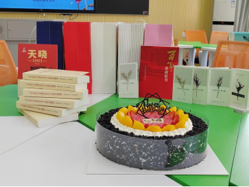随着欢快的《生日祝福歌》响起,所有人齐声唱生日歌,五位“小寿星”低头许下美好的愿望,一起吹灭蜡烛。在场的领导和老师为他们送上精心准备的《习近平新时代中国特色社会主义思想专题摘编》、《天晓》、《百年革命家书》等礼物。
